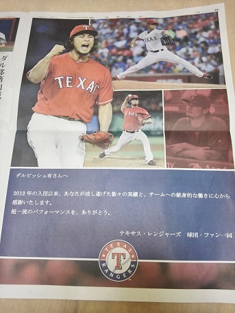 テキサスレンジャースを退団したとき、チームとファンが日本の新聞にこんな広告を掲載したとき、どんだけ愛されてたの。と思ったのですが、今回のできごとで、改めてあの広告を掲載したファンの気持ちが理解できました。